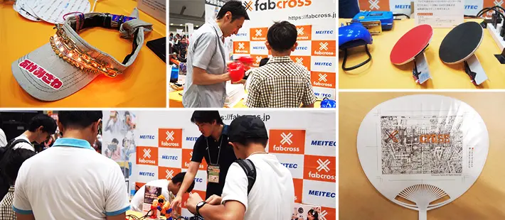 当社のブースでは、「fabcross」のものづくり企画で製作したり、紹介したりしている作品を展示。マイコンボードとギヤードモーターを使用してつくられた「人工的にイヤホンケーブルを絡ませるマシーン」、「1分間2400回転する卓球用ラケット」、「Wi-Fiの電波強度に応じて光り方が変わるサンバイザー」ほか、計5つの作品を紹介しました(各リンクから外部サイト「fabcross」の該当記事へ飛びます)。