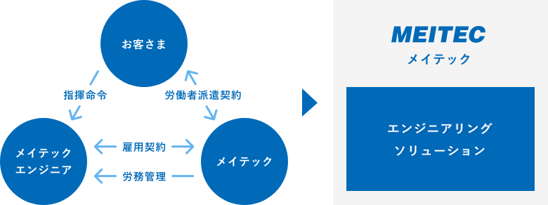 メイテックが、自社のエンジニアをお客さまに派遣し、お客さまの指揮命令下で業務に従事するのが特徴です。またお客さまとメイテックとの間で労働者派遣契約を締結します。